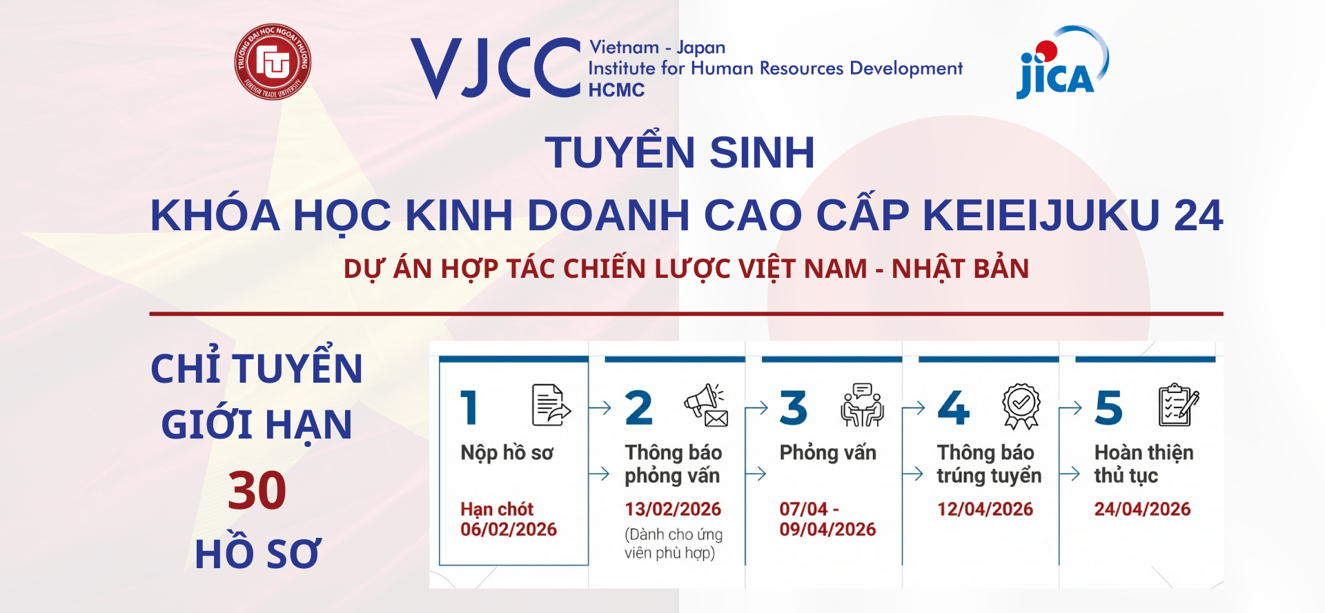 Xem thêmPhân Viện Phát triển Nguồn Nhân lực Việt Nam – Nhật Bản tại TP.HCM (VJCC-HCMC) thông báo mở đơn tuyển sinh Khóa học Kinh doanh Cao cấp Keieijuku – Khóa 24, thuộc dự án hợp tác giữa Trường Đại học Ngoại thương (FTU) và Cơ quan Hợp tác Quốc tế Nhật Bản (JICA).