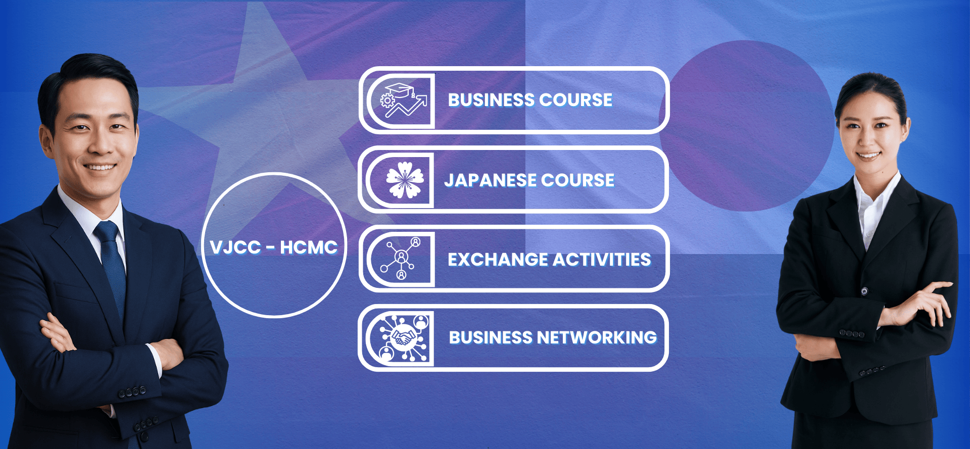Chủ yếu 4 hoạt động Khóa học về Kinh Doanh, Khóa học Tiếng Nhật, Hoạt động giao lưu văn hóa, Thư viện VJCC Tp.Hồ Chí Minh đã và đang khẳng định là một địa chỉ uy tín về đào tạo nguồn nhân lực, luôn đồng hành cùng các doanh nghiệp Việt Nam trên con đường đổi mới, hội nhập vào nền kinh tế thế giới, xứng đáng là biểu tượng của tình đoàn kết hữu nghị giữa hai đất nước Việt Nam – Nhật Bản.