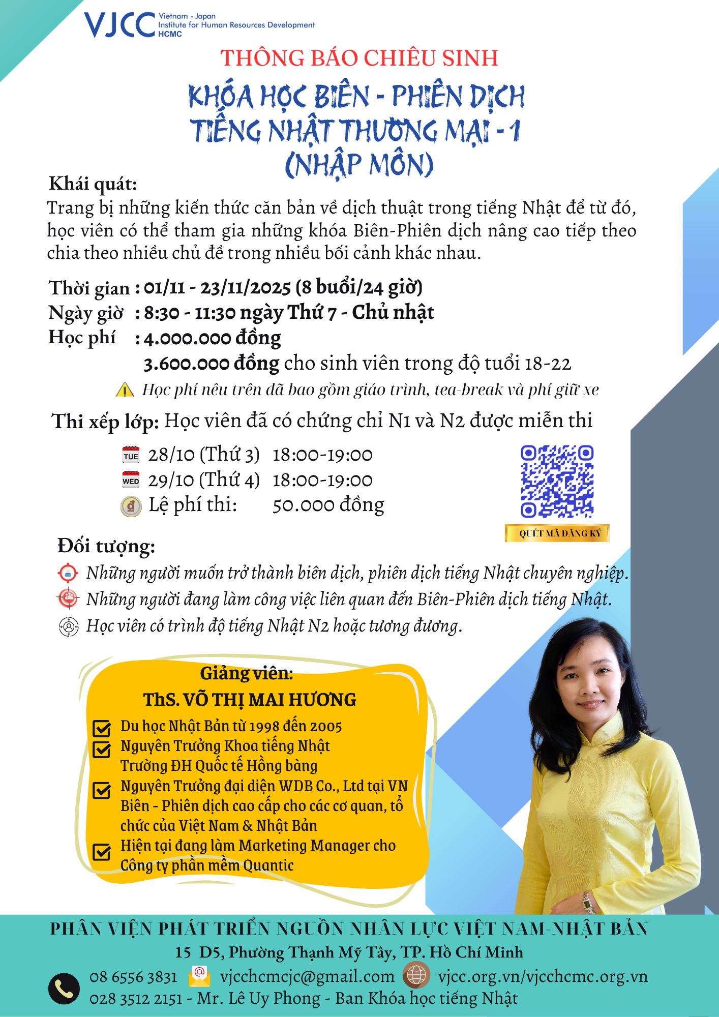 Khóa học Biên-Phiên dịch Nhật ngữ Thương mại tại Phân viện VJCC tại TP. HCM (gọi tắt là VJCC-HCMC) sẽ trang bị cho bạn nhiều kiến thức, kinh nghiệm cho nghề phiên dịch tiếng Nhật vốn đang có nhu cầu tuyển dụng không ngừng nghỉ tại TP. HCM và vùng lân cận.