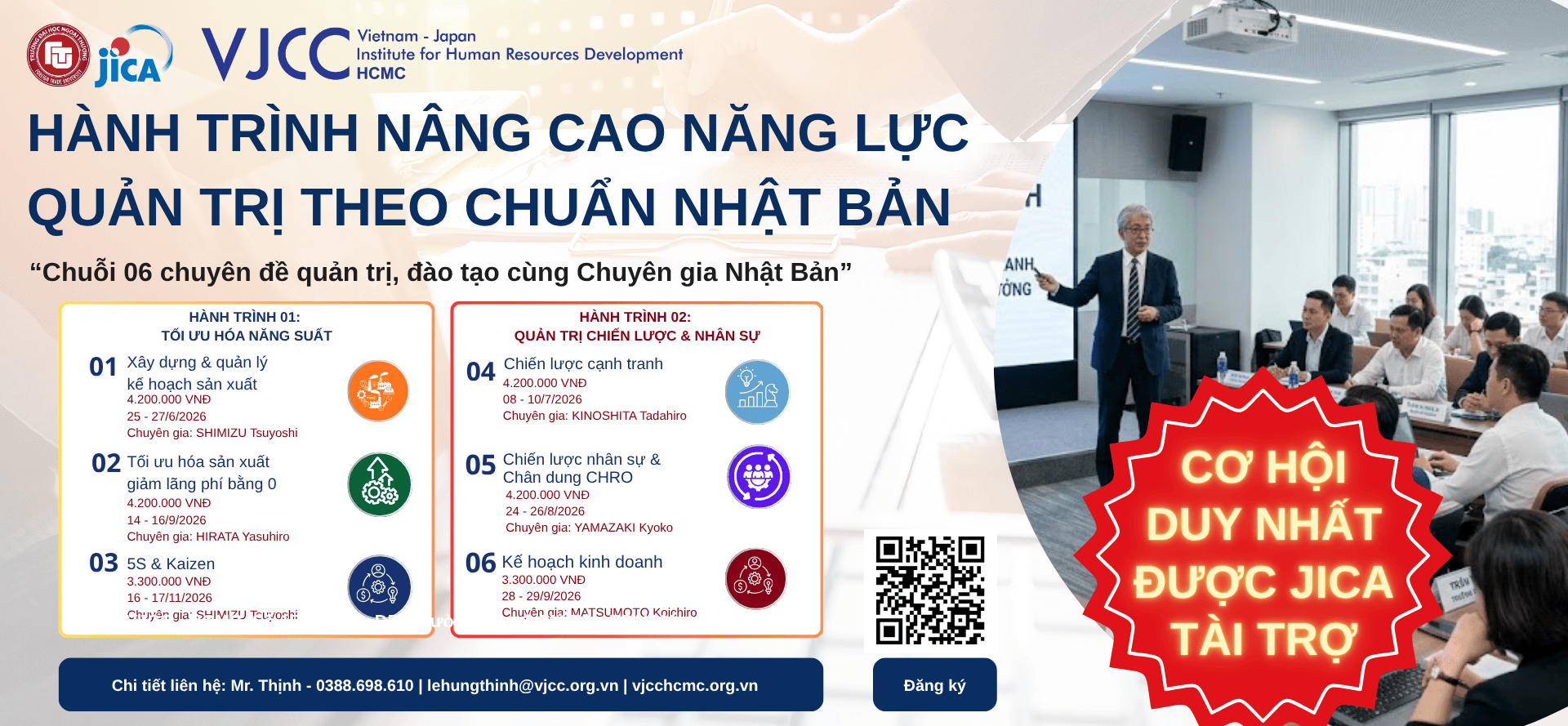 Xem thêmChuỗi 06 chuyên đề quản trị, đào tạo thực tiễn Giảng dạy bởi 100% chuyên gia cao cấp Nhật Bản Nội dung kế thừa từ chương trình kinh doanh cao cấp KEIEIJUKU