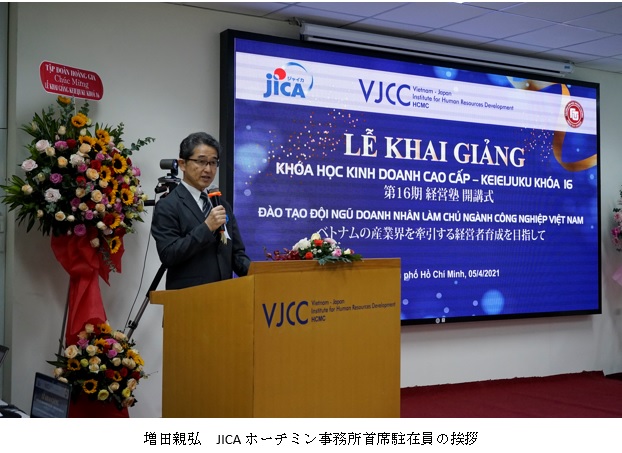 また本事業パートナーであるJICAを代表して、JICAホーチミン事務所の増田首席駐在員からは、経営塾が「日越式」ビジネス教育の新たな拠点となっていくことへの期待と「ウィズ・コロナ」「ポスト・コロナ」を見据え、VJCC、特に経営塾が果たして行く役割が今後ますます大きくなっていることに対する期待が述べられました。
