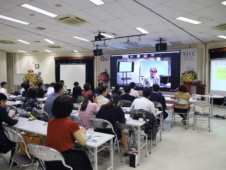 式典の最初に、VJCCインスティチュートのグエン・ティ・ヒエン所長が研修プログラム内容について紹介。COVID-19の影響下、一部遠隔研修を導入しているものの質を維持するためにオーディオ・通信機材導入を含む最大限の努力を行っている旨言及しつつ、経営塾がベトナム企業のグローバルサプライチェーンへの参加を助け、社会貢献など新たな企業の価値観を共有する機会となる旨説明しました。